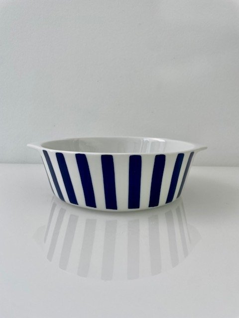 Une belle pièce de céramique danoise : ce bol de service vintage de la série Ildfast bien-aimée de Dan-Ild, produite par Lyngby Porcelæn. Le bol est peint à la main dans un motif frais et intemporel de rayures verticales bleu cobalt sur un fond blanc pur.