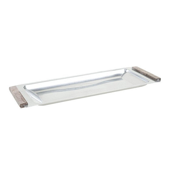 Plateau minimaliste en acier inoxydable avec poignées géométriques en bois, conçu dans les années 1960-1970. Sa forme élancée et son design épuré en font une pièce élégante du milieu du siècle, idéale pour servir des boissons et des amuse-gueules ou comme plateau décoratif.