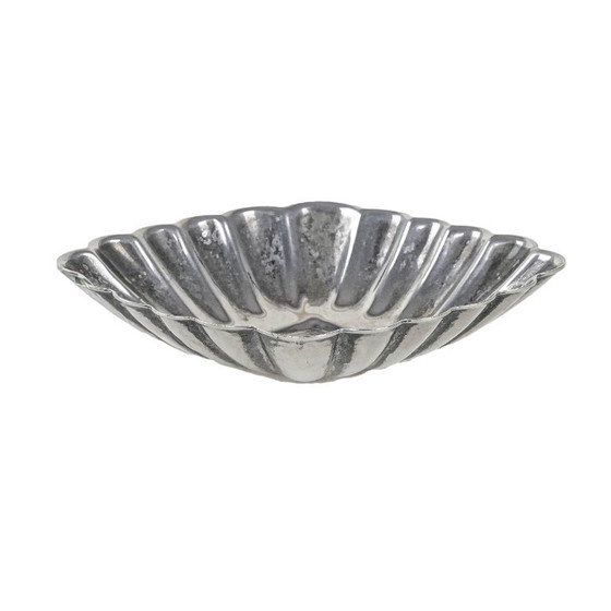 Petit plat/plateau décoratif en forme de coquillage, en métal argenté. Le délicat relief de sa surface lui confère une allure élégante et classique. Idéal comme plateau à bijoux, pour présenter des confiseries ou comme objet de décoration vintage.