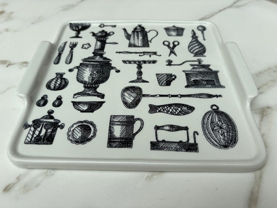 Voici une véritable pièce de collection, un plateau vintage de la collection finlandaise Arabia Design. Datant des années 1960, il a été conçu par Esteri Tomula et Kaj Franck. Ce plateau carré vintage, muni de poignées, mesure 23 cm de large et de long. Fabriqué en porcelaine émaillée crème, il est orné d'un décor noir représentant des ustensiles de cuisine anciens. En parfait état.