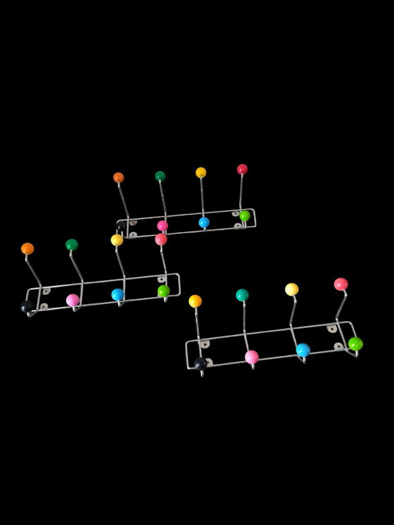 Trois jolies patères popart en forme de spoutnik datant des années 1970. En bon état, certaines des boules ont subi une légère décoloration au fil des ans. Les patères mesurent 35 cm de long, 15 cm de haut et 12 cm de profondeur.