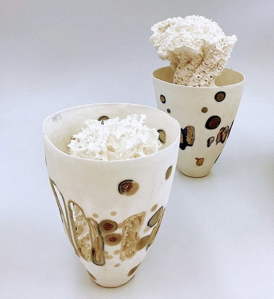 Ces objets uniques en céramique allient une beauté fragile à une texture ludique. Chaque pièce est façonnée à la main et finie avec des détails de glaçure incrustés dans des tons de terre et de bleu profond. L'ajout sculptural au sommet rappelle le corail ou les éponges naturelles, donnant à chaque pièce une sensation vibrante, presque respirante.
