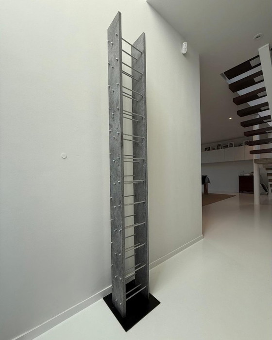 Porte-CD/livres de Pol Quadens, conçu à l'origine comme un porte-CD/DVD, mais parfaitement utilisable comme porte-livres grâce à ses tiges amovibles. Matériau : granit + métal.