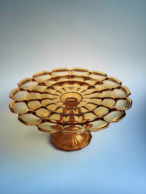 Cet élégant porte-gâteau Art déco fait partie de la série Lady, produite par Ankerglas Bernsdorf en 1932. Fabriqué en verre ambré, il présente un remarquable motif en nid d'abeille sur le bol, qui rehausse son esthétique géométrique. La haute base cannelée du piédestal ajoute au raffinement et à la stabilité, ce qui en fait un mélange parfait de fonctionnalité et de design. Un exemple stupéfiant de l'artisanat du verre pressé des années 1930, idéal pour les collectionneurs et les amateurs de verre vintage.