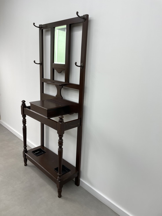 Porte-manteau sur pied des années 1920, doté d'un petit miroir central, d'un compartiment à gants en dessous et de deux poches latérales pour cannes et parapluies. Pratique et décoratif, il est vendu avec ses bacs d'égouttage en plomb d'origine.