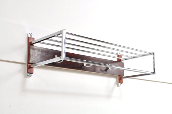 Magnifique porte-manteau mural vintage des années 1960. Ce porte-manteau chromé est en excellent état et possède trois crochets doubles ainsi qu'une étagère à chapeaux.