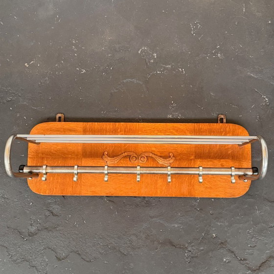 Porte-manteau des années 1950. Barre chromée avec 7 crochets et un porte-chapeaux. Le dos est plaqué chêne avec un élément décoratif réalisé à la main.
