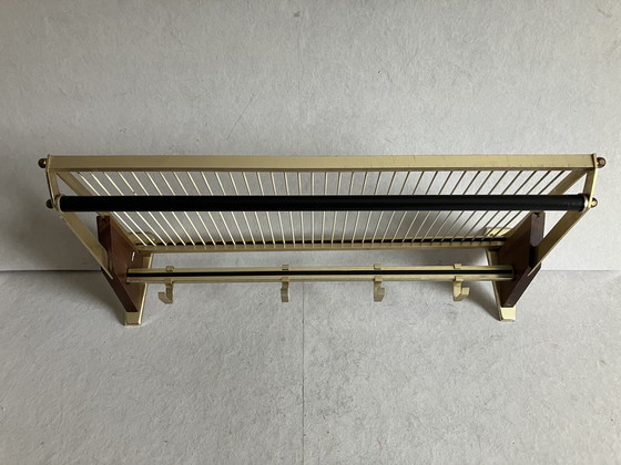 Porte-manteau mural vintage en laiton et bois de belle taille pour le hall d'entrée ou la chambre. Le porte-manteau a 4 crochets, une tige pour les cintres et sur le dessus vous pouvez ranger les chapeaux et les casquettes. Période Mid Century MCM des années 50.