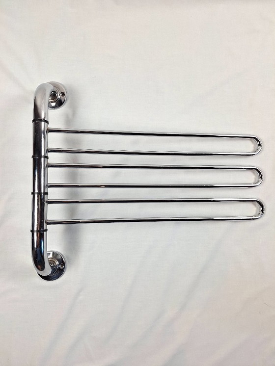 Porte serviette chromé 70s composé d'une tige sur laquelle pivotent trois branches indépendantes.