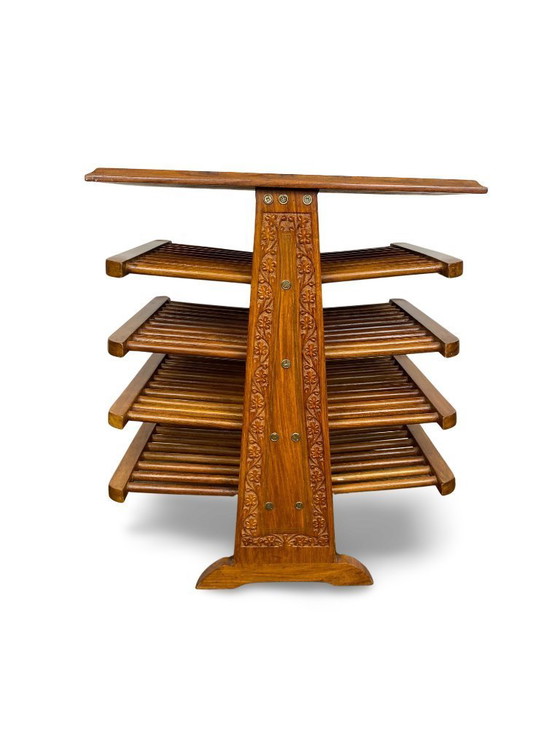Ce porte-revues en bois sculpté est une belle pièce de mobilier datant des années 1950, caractéristique du style moderniste du milieu du siècle (mid-century modern), dans l'esprit du designer américain Edward J. Wormley. Il présente une structure raffinée en bois massif, finement sculpté de motifs floraux sur les côtés, et orné d’une marqueterie florale en laiton incrustée au centre du plateau.