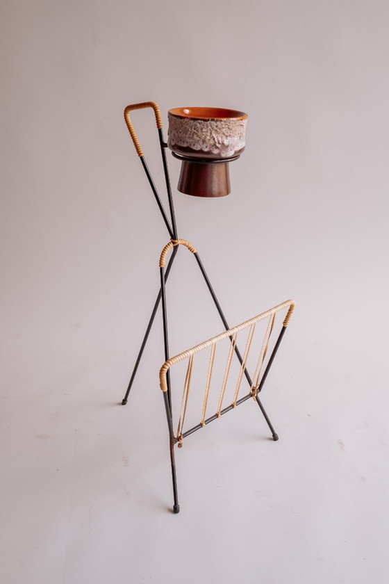Porte-revues Pilastro unique des années 1950. Fabriqué en métal noir avec des détails tressés. Ce porte-revues possède un support rond pouvant accueillir divers objets, comme le chandelier présenté sur l'exemple (non inclus, mais disponible séparément). Il peut également servir de support pour un vase ou un pot de fleurs avec une plante.