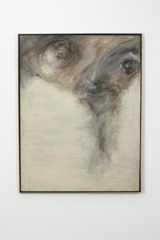 Portrait expressionniste de Scholz. Cette peinture quasi abstraite date des années 1960. C'est une grande toile expressive sur panneau, encadrée de chêne. Cette œuvre fait partie d'une série dont nous possédons plusieurs exemplaires. Les couleurs étant difficiles à reproduire en photo, n'hésitez pas à prendre rendez-vous pour la voir. Elle présente des traces d'usure normales pour son âge.