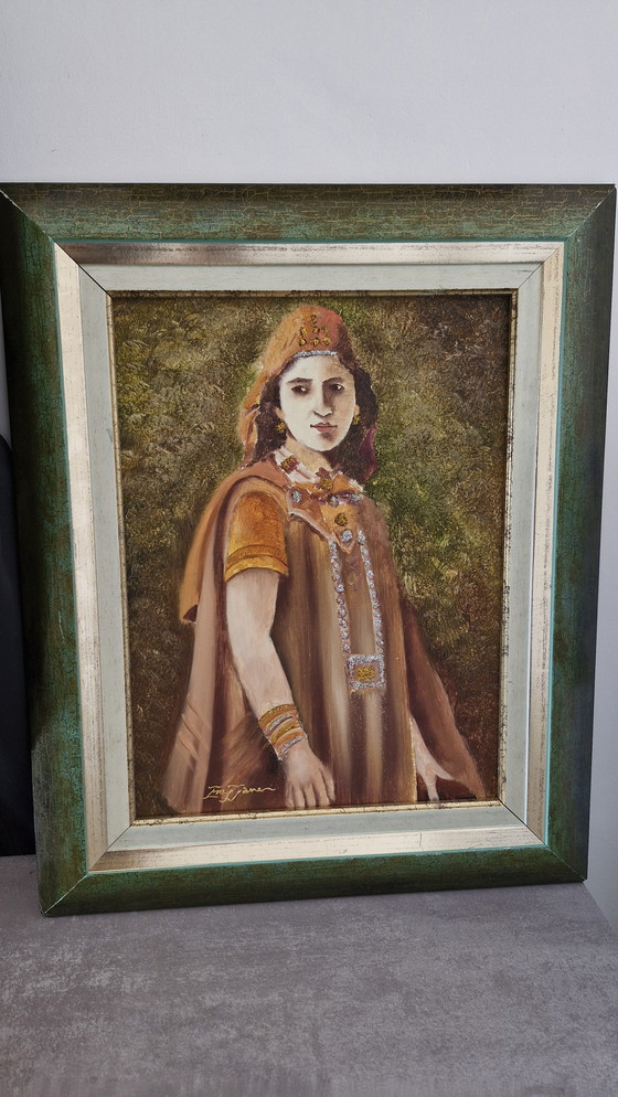 ŒUVRE originale signée - Portrait royal féminin Tableau élégant et raffiné représentant une femme noble aux bijoux scintillants et à la posture majestueuse. Tons chauds, détails soignés et fond texturé. Encadrement en bois patiné vert et ivoire. Une pièce unique au charme intemporel.
