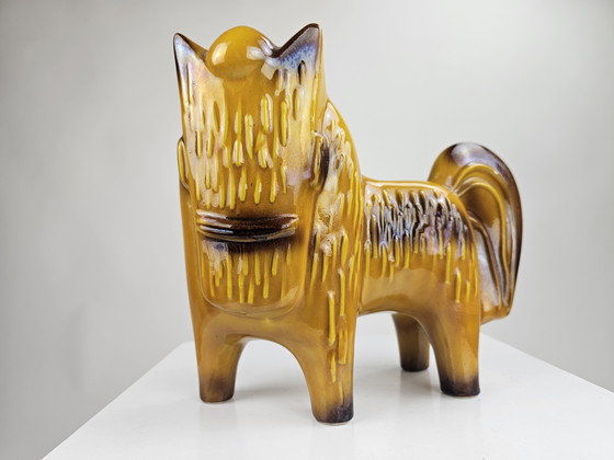 Ce charmant pot en céramique en forme de cheval est une pièce unique provenant d'Italie. Le pot a une couleur jaune chaud avec des accents bruns, ce qui lui donne un aspect vintage. Il est parfait pour ajouter une touche ludique et artistique à votre intérieur. Idéal pour les petites plantes ou comme objet décoratif.