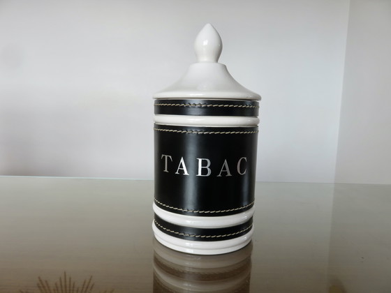 Pot à tabac en céramique blanche cerclé de Skaï noir, France, 1970. Hauteur 24cm. Diamètre 12cm. Très propre, en parfait état. Très joli modèle peu courant.
