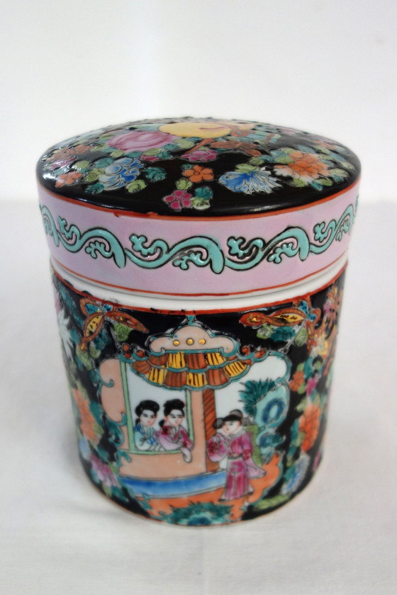 Ancienne boîte couverte ou pot en porcelaine de Chine, famille noire du milieu du XXe. Décor polychrome à décor de scènes animées, peint à la main. Cartouche de Qianlong apocryphe. Très bel état de conservation.