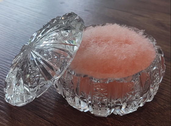 Ancien poudrier avec sa houppette en duvet de cygne . Décoration en verre taillé , ciselé et forme bombée.