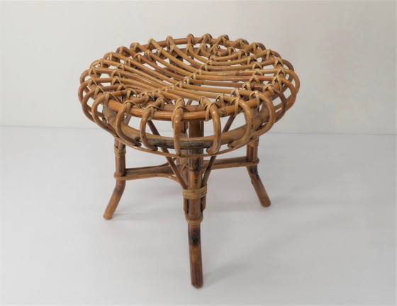 Tabouret rond en bambou et rotin dans le style de Franco Albini. Très bon état Circa : 1960 Italie Hauteur : 42 cm / 16.5 inches Largeur : 44 cm / 17.3 inches Profondeur : 44 cm / 17.3 inches Poids : 2 KG REF : NCA4490323