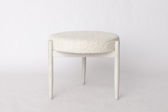 Pouf / Tabouret Vintage 1970 - Bois de hêtre blanc et tapisserie de laine - Ottoman Mid Century