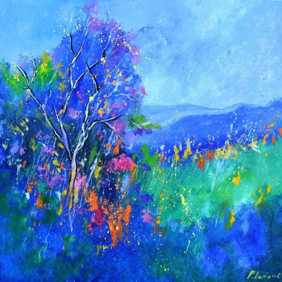 Cette œuvre, empreinte de vitalité, dépeint un paysage vibrant où la nature s'exprime avec intensité. Dominée par des nuances de bleu et de violet, la scène évoque une atmosphère de rêve et de mystère. Au premier plan, un arbre aux branches élancées et aux feuilles multicolores symbolise la force et la résistance. Les éclats de couleurs vives, comme le rouge et l'orange, contrastent magnifiquement avec l'arrière-plan serein des montagnes lointaines, créant une dynamique visuelle captivante. Chaque coup de pinceau semble vibrer, donnant à la peinture une impression de mouvement et de vie. L'artiste a capturé l'essence d'un paysage enchanteur, offrant au spectateur une expérience visuelle immersive. Ce mélange harmonieux de couleurs et de formes invite à la contemplation et à la réflexion sur la beauté éphémère de la nature.