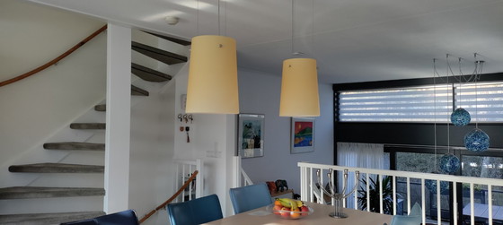 La lampe Prandina Sera S1/11 est une lampe suspendue élégante au design moderne, dotée d'une élégante structure en métal argenté et d'un abat-jour en verre ambré. Fabriquée en Italie, cette lampe peut accueillir jusqu'à 2 ampoules E27 de 150 watts, ce qui permet d'éclairer amplement n'importe quelle pièce. Son design élégant en fait un complément parfait aux intérieurs contemporains. Lot de 2 lampes. Dimensions : 37,5 cm de haut, 27,5 cm de diamètre en bas, 22,5 cm en haut. Couleur ambre unique, donnant une belle lumière chaude. Cette couleur n'est plus disponible. Ensemble complet.