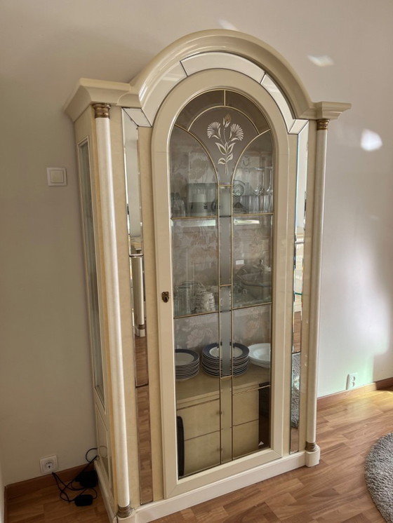 Magnifique vitrine très brillante de couleur blanc-crème provenant d'une usine italienne. L'intérieur de la vitrine est recouvert d'un magnifique jacquard de soie et de velours. La vitrine est équipée d'un éclairage intérieur.