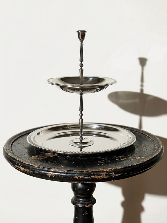 Le plateau inférieur de 25cm de diamètre et le plateau supérieur de 16cm sont reliés par une colonne centrale tournée, pour une hauteur totale d’environ 26cm. Très bel état général. À signaler toutefois quelques rayures d’usage visibles sur une partie du plateau inférieur, plus ou moins discrètes. Environ 750gr.