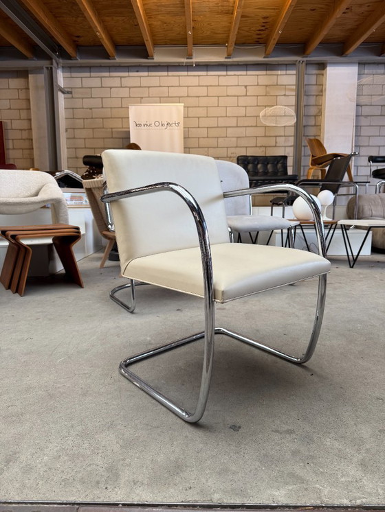- Confectionné en cuir blanc haut de gamme et doté d'une structure en chrome poli, ce fauteuil allie durabilité et raffinement.