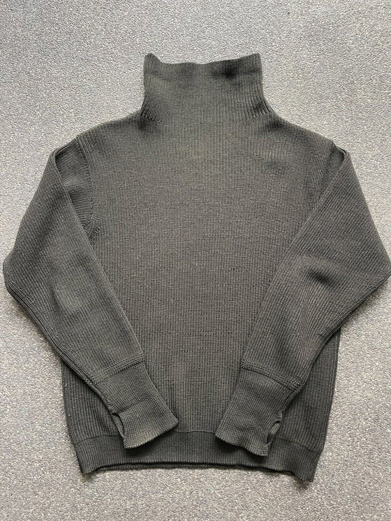 Cet article est en très bon état. Sa couleur est le très recherché taupe naturel (gris-brun). Sa particularité réside dans sa symétrie : le pull n'a ni devant ni dos, ce qui réduit l'usure et préserve sa coupe.