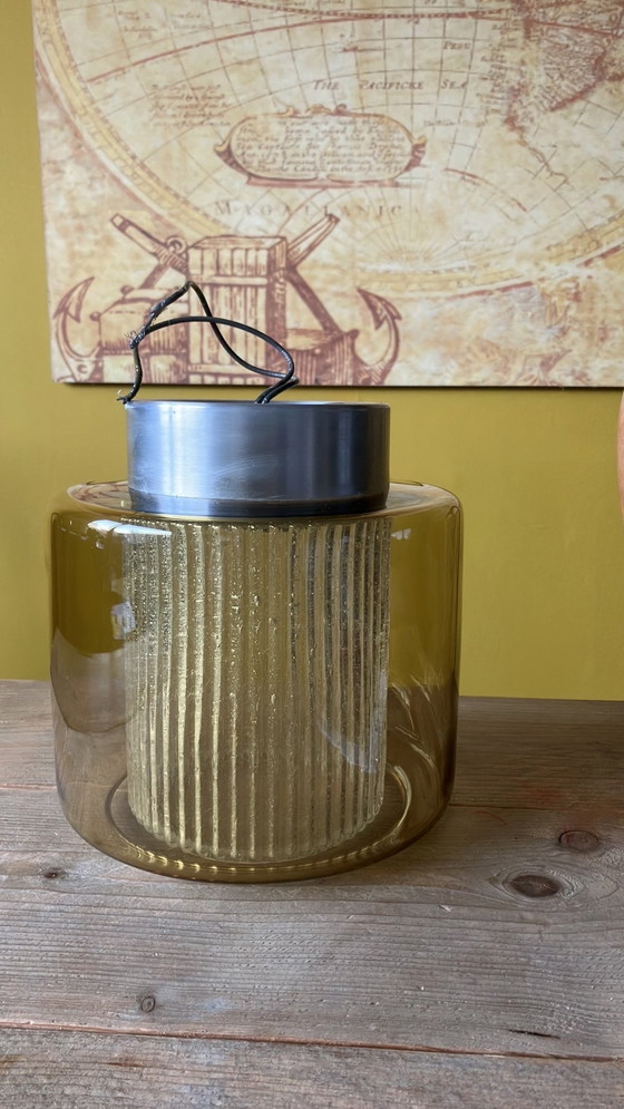 Cette lampe suspendue Raak présente un design vintage avec une belle combinaison de verre jaune et de métal argenté. L'intérieur du verre a une texture striée, ce qui ajoute une touche unique à son apparence. Elle est parfaite pour ajouter une touche rétro à n'importe quelle pièce. La lampe est en bon état, avec seulement des rayures mineures sur la partie métallique, et est prête à être un ajout élégant à votre maison.