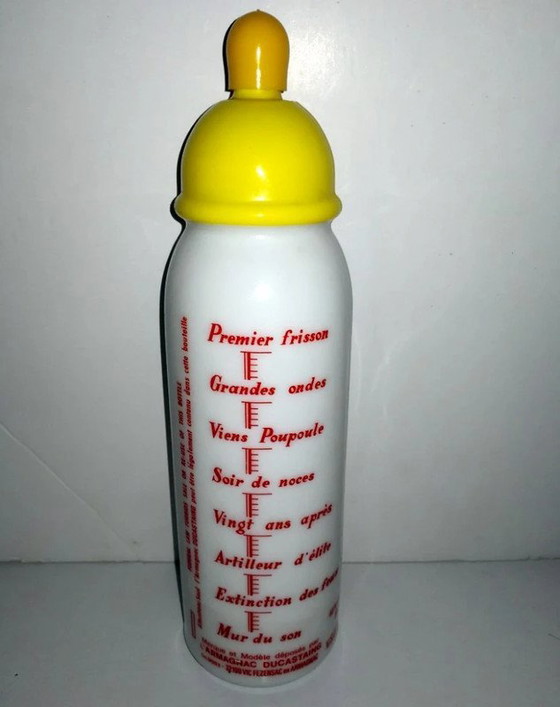 Biberon ancien, en excellent état y compris les textes sur la bouteille ni usés ni égratignés. Dimensions: Hauteur 29 cm et diamètre à la base 7 cm. Sa contenance est de 70 cl. Époque: 1960, quasi introuvable. Envoi soigné le jour même.
