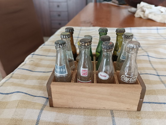 Splendide et rare coffret de collection composé de 12 bouteilles miniatures originales des années 1960, conservées dans leur coffret en bois d'origine. Ce coffret est un morceau d'histoire des boissons à l'échelle internationale et comprend des marques emblématiques de sodas : Coca-Cola, Pepsi, Fanta, Teem (orange et citron). On y trouve également des spécialités argentines : bière BiecKert, Misoda, Pent et d'autres variantes rares. Toutes les bouteilles sont scellées par leur capsule d'origine et n'ont jamais été ouvertes.