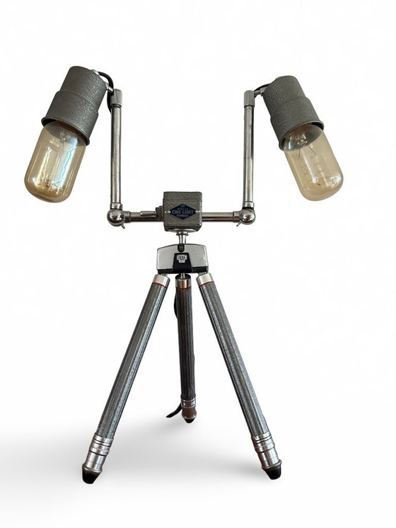 Fabriqué en métal massif avec un revêtement gris martelé caractéristique, il est monté sur un trépied Bilora (Allemagne).