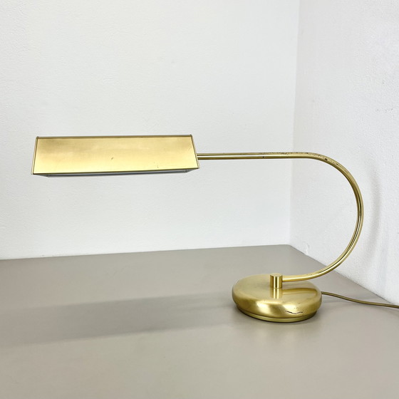 ARTICLE : lampe de table AGE : DESCRIPTION : lampe de table moderniste allemande des années 70 en laiton et métal avec un abat-jour ajustable sur le devant du long bras de lumière. la lampe a une taille extraordinaire de 64cm en longueur et 36cm en hauteur. le design rappelle strictement le style des oeuvres de KOCH ET LOWY. Ce luminaire a une douille pour les ampoules, qui est couverte par l'élément d'ombrage avant, ce qui crée une belle atmosphère lumineuse, grâce à la lumière indirecte. Hauteur : 36 cm Profondeur : 17,5 cm Longueur : 64 cm ÉTAT : En bon état d'origine, avec une patine normale sur le métal, en parfait état de fonctionnement.