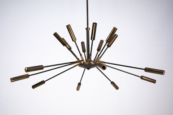 Le lustre se compose d'un moyeu central en laiton d'où rayonnent douze bras, chacun se terminant par une douille cylindrique en laiton pour ampoule E14. Sa composition sculpturale en forme d'étoile incarne parfaitement le modernisme italien raffiné et le design d'éclairage novateur qui ont caractérisé la production d'après-guerre de Stilnovo.
