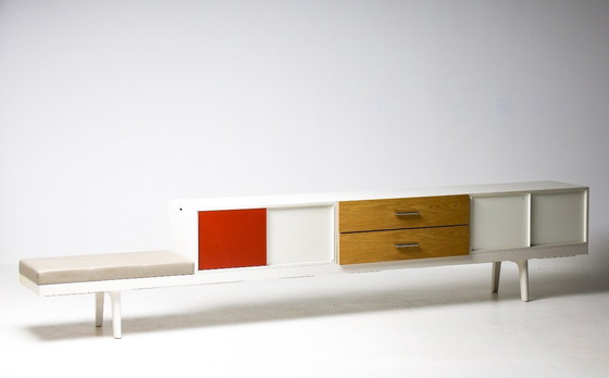 *Un rare banc modulaire en acier émaillé avec 3 compartiments de rangement interchangeables et 1 assise en cuir, vous permettant de créer la configuration que vous souhaitez.