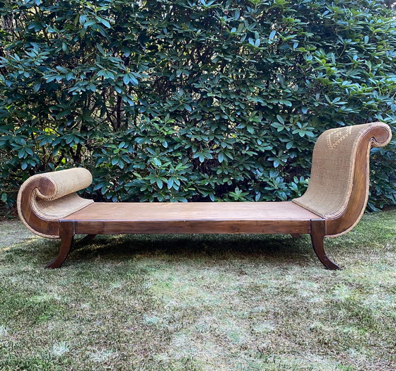 Cette chaise longue rare allie élégance et confort grâce à sa belle structure en bois et à ses détails en rotin tressé. Le design dégage un charme vintage, parfait pour tout décor classique ou rustique. Le cadre en bois robuste offre une grande durabilité, tandis que le rotin lui confère un aspect naturel. Idéal pour se détendre avec style. Signes légers d'utilisation.