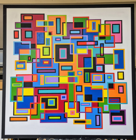 Cette œuvre d'art, intitulée "Rectangles Volume 3", est une peinture abstraite vibrante montrant un jeu dynamique de rectangles de différentes couleurs et tailles. Peinte sur un panneau Mdf préparé au gazogène, l'œuvre utilise une large gamme de couleurs vives, dont le rouge, le bleu, le vert, le jaune et d'autres encore, toutes soulignées par des accents noirs. Cette œuvre est parfaite pour les amateurs d'art moderne et abstrait et peut constituer un point de mire saisissant dans n'importe quelle pièce. Conseil : consultez les autres annonces de Franklin sur Whoppah.