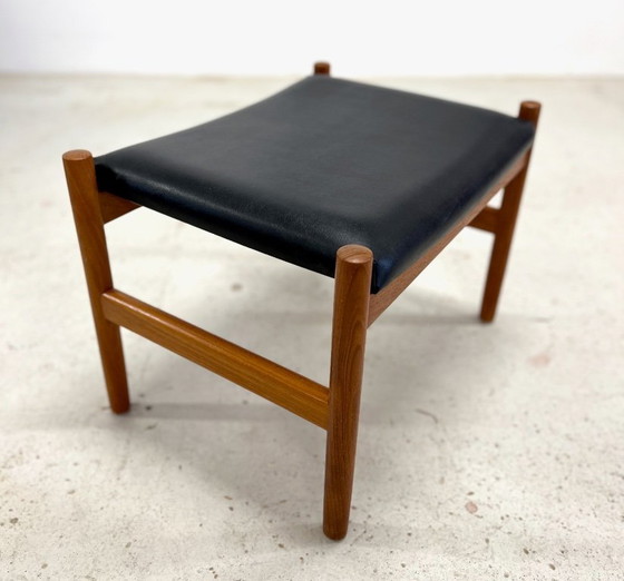 Description : Pouf/tabouret en teck, design Hugo Frandsen, revêtu de similicuir noir pour Spøttrup Møbler Danemark. Idéal pour accompagner un fauteuil ou comme tabouret. Récemment retapissé, il est en excellent état vintage. Deux exemplaires disponibles.
