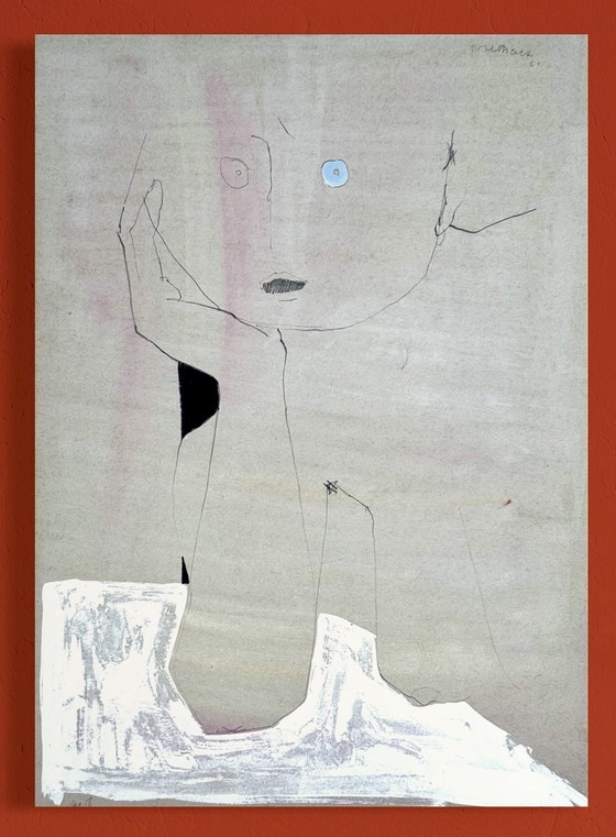Cette œuvre de Robert Detheux, datée de 1961, mesure 45 cm x 32 cm. Elle présente un style surréaliste distinctif avec des traits minimalistes et des éléments abstraits. Le visage esquissé, avec un œil coloré, évoque une introspection onirique, tandis que les formes blanches au bas ajoutent une dimension mystérieuse. Cette pièce témoigne de l'exploration artistique de Detheux durant les années 1960, mêlant simplicité et profondeur visuelle.