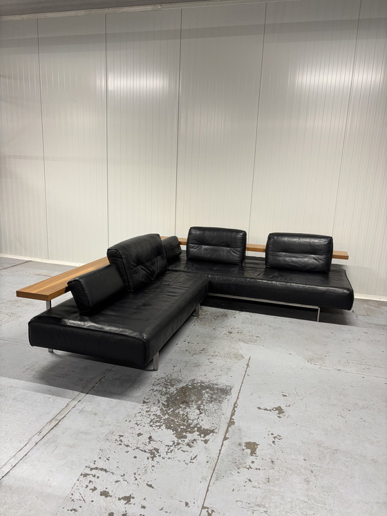 Canapé d'angle Dono de Rolf Benz en très bon état. Le cuir de haute qualité est comme neuf. La base est en acier inoxydable. Pièce la plus longue : 300 cm avec plaque en bois Pièce la plus courte : 270 cm Profondeur : 110 cm Profondeur de l'assise : 80 cm Hauteur de l'assise : 42 cm.