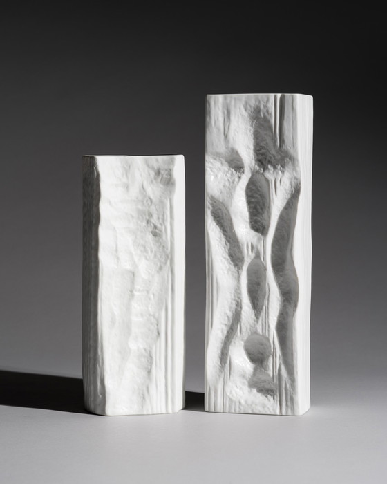 Ce duo de vases sculpturaux, d'une grande force expressive, a été conçu par Martin Freyer pour Rosenthal dans les années 1970. À cette époque, Rosenthal Studio-Linie collaborait avec des designers avant-gardistes pour redéfinir la porcelaine comme médium de l'art contemporain.