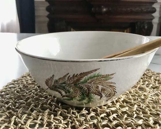 Saladier rond vintage. Digoin Sarreguemines fin des années 40. Véritable opaque. Modèle Lamartine (rare). Décor végétal fougères marrons et vertes tout en finesse. Liseret doré sur le contour. Très bon état général d’usage. Petites traces d’utilisation. diam 25 cm hauteur 10,5 cm envoi possible mondial relay ou colissimo sur demande