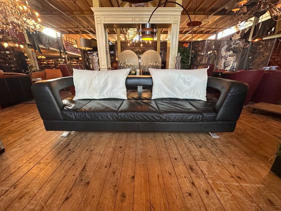 Il s'agit d'un modèle d'exposition haut de gamme, confectionné en cuir noir épais et souple de première qualité. Les coussins blancs contrastants soulignent les lignes épurées et créent une ambiance luxueuse. Grâce à ses dimensions généreuses et à son rembourrage ferme, ce canapé offre un confort d'assise exceptionnel.