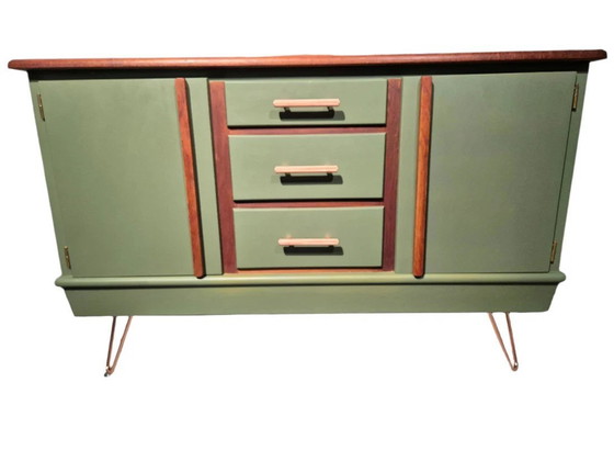 Commode remise à neuf à la main. Fabriquée en merisier massif (façades de tiroirs et cadre) et en placage (plateau). Fabriquée à l'origine et ayant appartenu à une famille luxembourgeoise. Convient pour le couloir et le salon. Peut également être utilisé comme meuble TV. Disponible avec ou sans le miroir. Le miroir peut également être rénové. Remis à neuf à la main à Sandweiler, Luxembourg, par le restaurateur de meubles Elad - Duke Restorations.