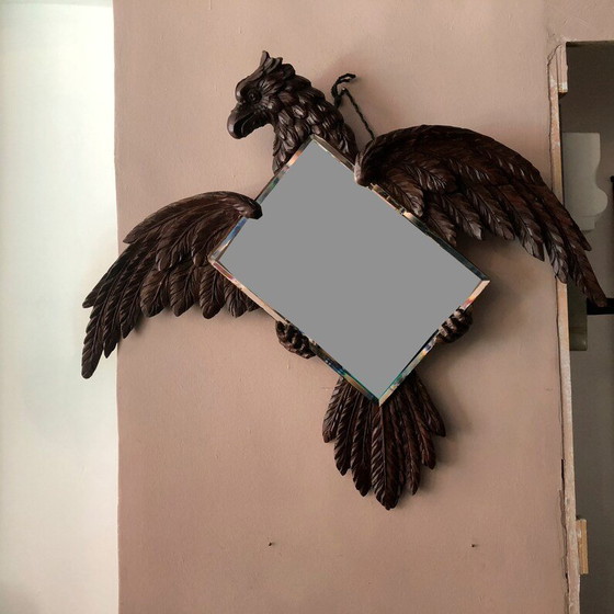 Majestueuse sculpture en bois représentant un aigle incrusté d'un miroir rectangulaire biseauté. Cette pièce de la fin du XIXe siècle présente des détails et des gravures finement travaillés par des maîtres artisans de l'époque. Cette sculpture est unique par sa grande taille. Ce sont des pièces particulièrement charmantes et rares. De légères traces d'usure sont visibles. Des réparations mineures ont été effectuées, mais la sculpture est globalement en parfait état. Dimensions de la sculpture : 90 x 104 cm. Dimensions du miroir : 45 x 36 cm.