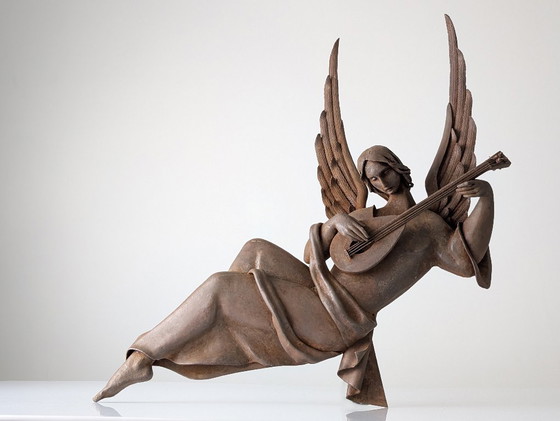 Cette imposante sculpture murale monumentale, forgée à la main en Espagne au début du XXe siècle, est un véritable chef-d'œuvre de la ferronnerie artisanale. Elle représente un ange céleste, allongé, jouant sereinement du luth, figeant un instant d'harmonie céleste. L'œuvre est réalisée avec une virtuosité exceptionnelle, transformant le métal ferreux inflexible en un drapé fluide et classique, et en ailes finement détaillées qui suggèrent le mouvement. Le visage de l'ange arbore une expression paisible et contemplative, caractéristique de l'esthétique néo-Renaissance, si prisée dans l'art monumental espagnol de l'époque. La robuste structure en fer conserve une patine oxydée naturelle et profonde qui souligne son caractère historique et sa grande profondeur visuelle. Conçue pour une intégration architecturale remarquable, elle est munie au dos de deux supports en fer massif, permettant une fixation murale sécurisée. Cette pièce maîtresse saisissante allie symbolisme spirituel et élégance intemporelle de l'artisanat monumental espagnol.