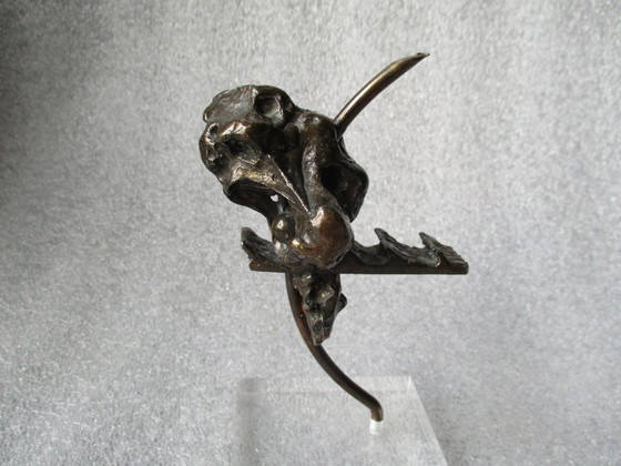 Sculpture en bronze sur une tige métallique et un socle en plastique transparent.