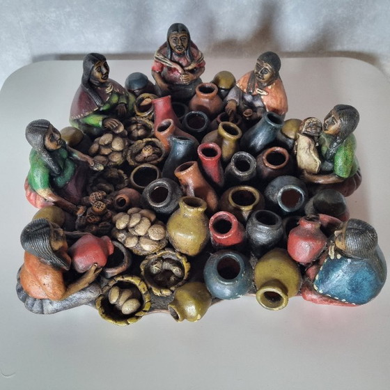 Sculpture en terre cuite Péruvienne représentant des femmes, enfant, et jarres des années 1970 .