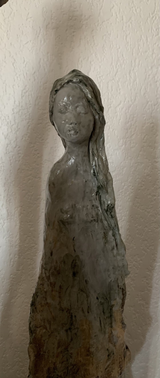 Découvrez cette sculpture unique en terre et bois flotté, une fusion harmonieuse de matériaux naturels et d'art moderne. Cette pièce captivante évoque une présence sereine et intemporelle, idéale pour enrichir votre espace de vie avec une touche d'élégance naturelle.